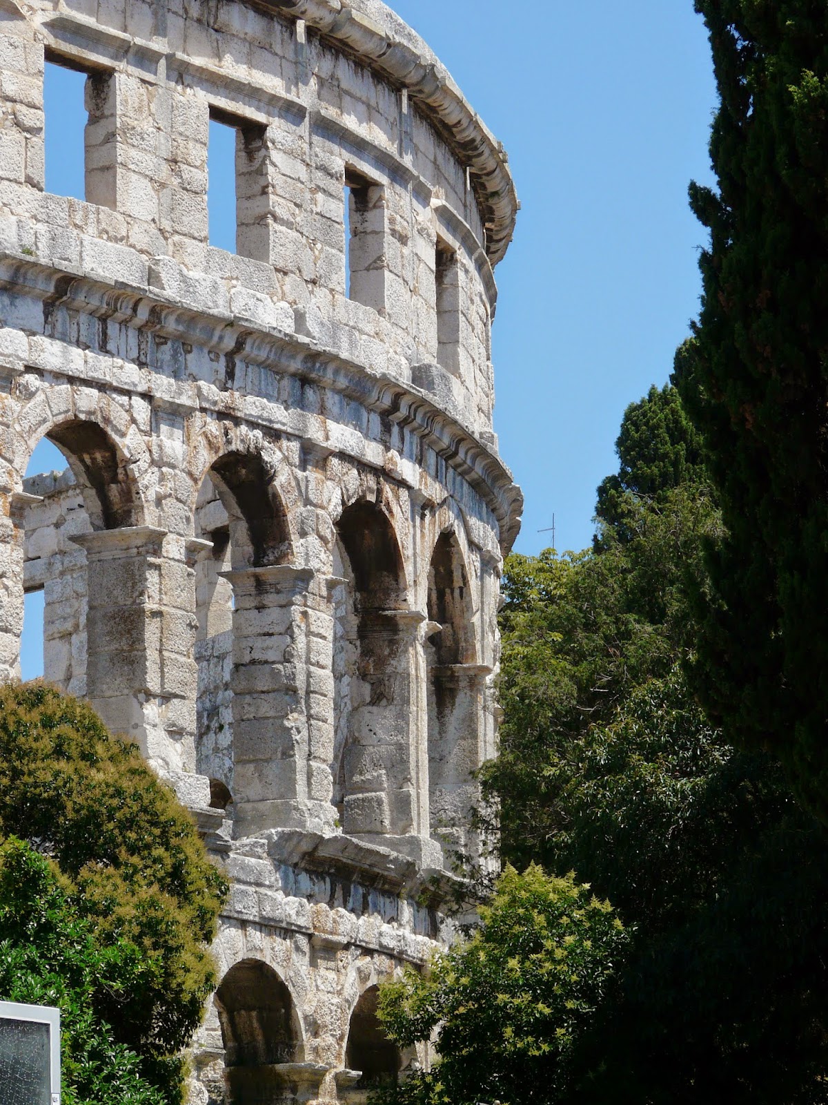 Amfiteátrum: A háromemeletes, ovális alakú kőkolosszust valószínűleg i.e.30-tól-i.sz.14 között Agusztus császár parancsára építették, s Vespasianus császár idejében bővítették ki. Hosszabbik tengelye 132, a rövidebbik 105 m. Az amfiteátrum napjainkban is új életre kel az évről évre ismétlődő Isztriai hetek alatt. Száz reflektor fényében operaelőadások, hangversenyek,népi tánccsoportok produkciója látható.